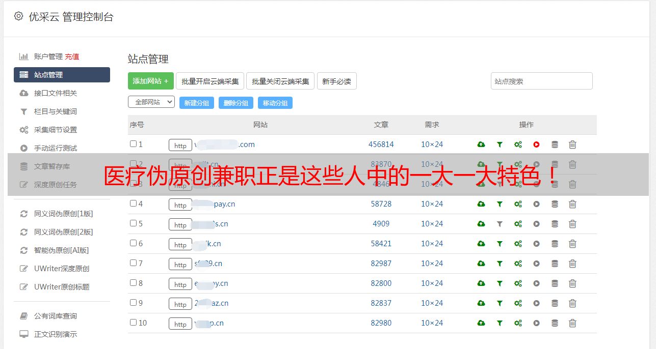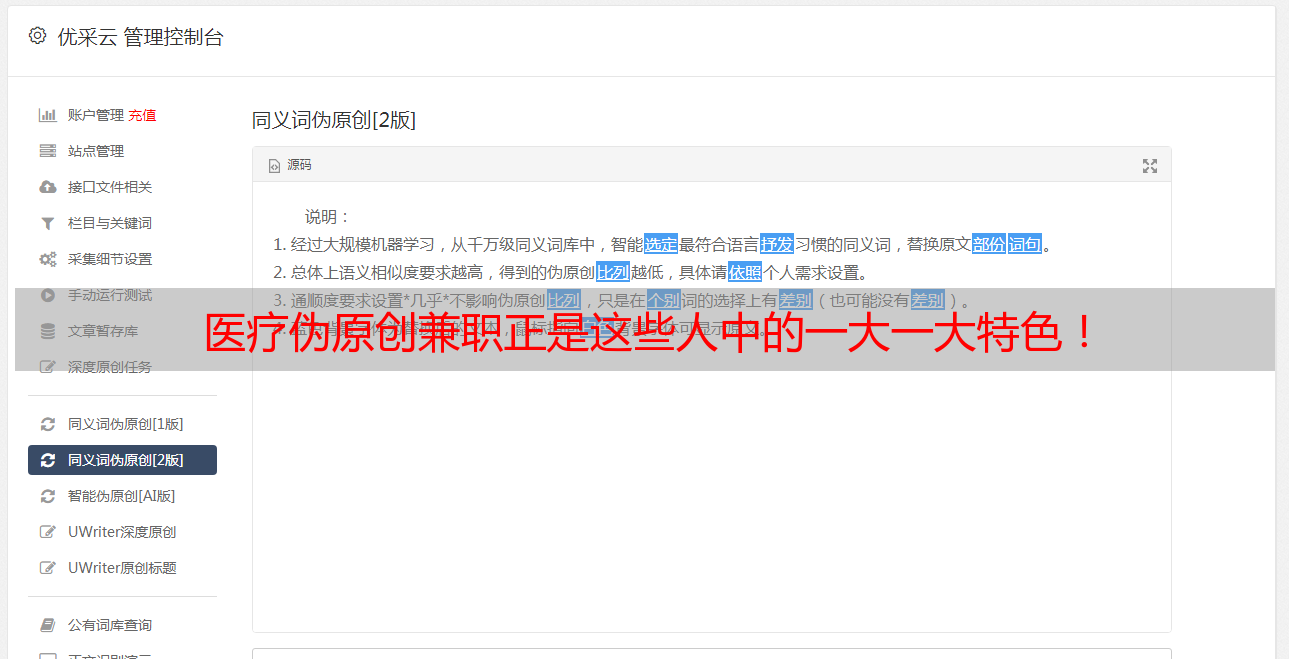优采云 发布时间: 2023-02-06 14:37随着社会的发展,人们的生活水平也在不断提高。在当今时代,许多人把*敏*感*词*作为一种补充收入的方式来使用。而医疗伪原创*敏*感*词*正是这些人中的一大特色。