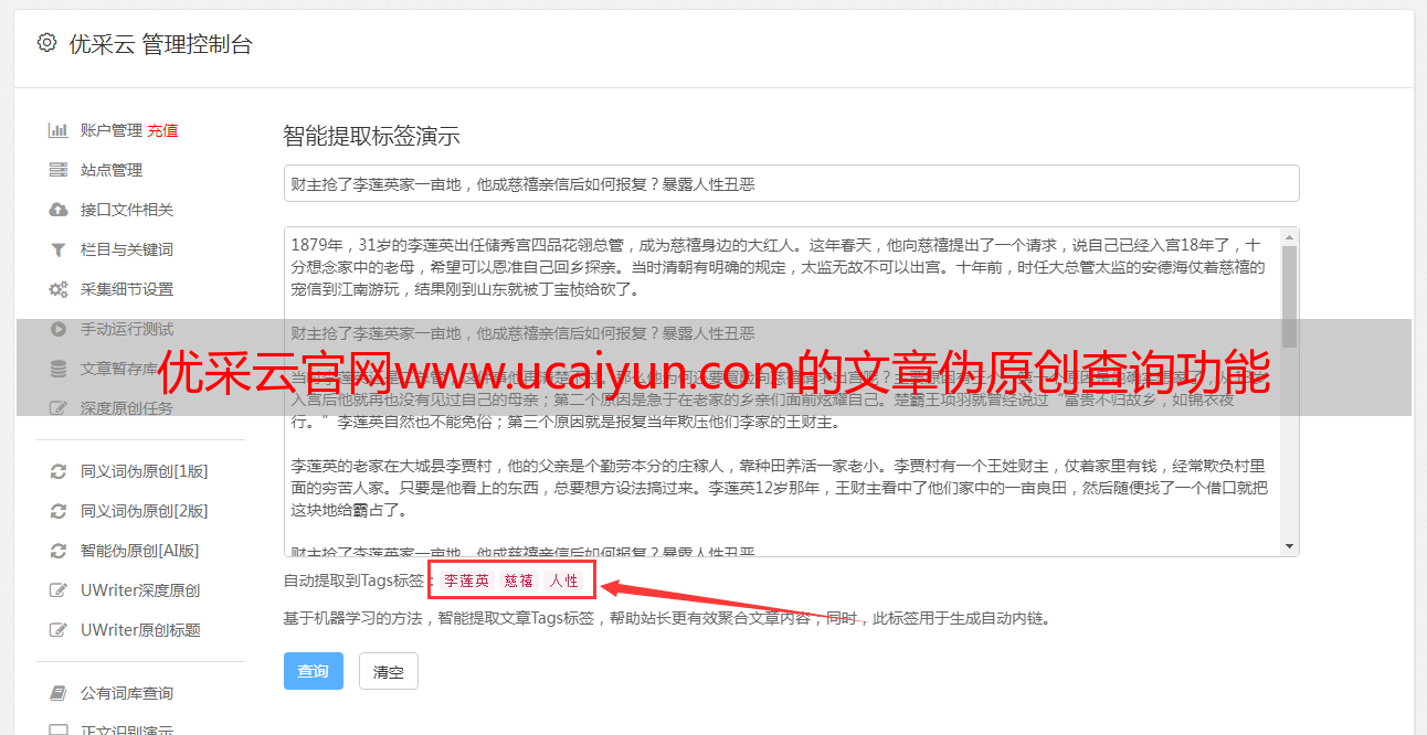 优采云官网www.ucaiyun.com的文章伪原创查询功能
