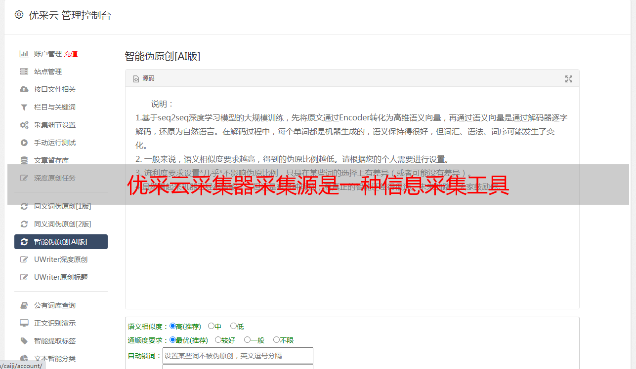 优采云是一款性能卓越的采集器采集源,不仅能够帮助用户快速定位目标网站上的有价值信息;而且也可以帮助用户在SEO方面有所作为。如果你正在寻找一个能够快速而准确地帮助你获得相关信息并提供SEO优化服务的工具,不妨试试优采云。它将为你带来前所未有的便利。它的官网是www.ucaiyun.com ,如有任何问题也可以前往此处咨询。