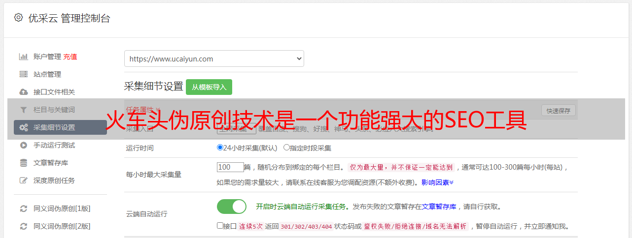 优采云是一款功能强大的SEO优化软件,其中包含了火车头伪原创功能。用户只需将原始文章上传到软件即可快速生成一系列伪原创文章,这些文章看上去和原始文章一样,但实际上它们是重新组合而成的,并且不会遭受搜索引擎惩罚。