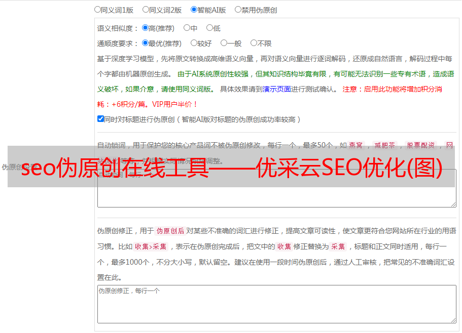 优采云SEO优化是一款非常方便实用的seo伪原创在线工具,它可以帮助用户快速、准确地生成高质量的文章,而且不需要用户进行复杂的文字处理。