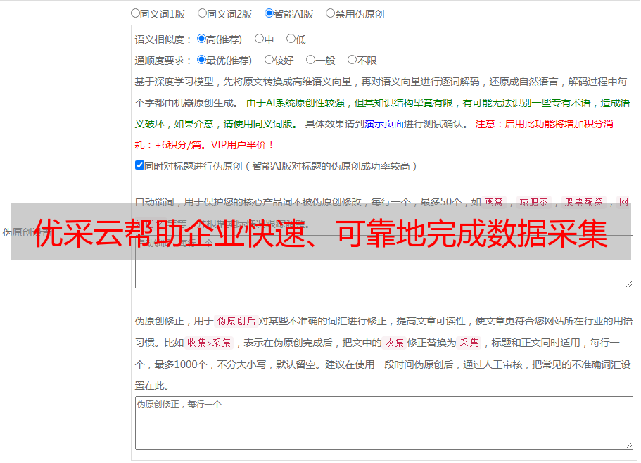 优采云是一款专业的数据采集软件,它能够帮助用户快速、可靠地完成数据采集工作。它不仅能够帮助用户准确地抓取有用的信息,而且还能够根据用户的具体要求进行精准筛选。此外,优采云还能够帮助用户进行SEO优化,从而使用户的网站在搜索引擎中获得更高的排名。