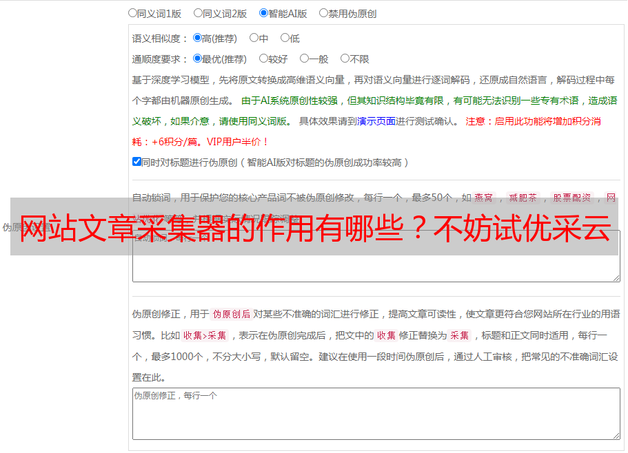优采云是一款专业的文章采集器,旨在帮助用户快速、高效地从互联网上采集有价值的文章内容。优采云不仅能够快速抓取各种格式的文本内容,还可以抓取图片、视频、音频、新闻等多种格式信息,并且可以对所采集内容进行分类整理,方便用户浏览。此外,还具备SEO优化功能,能够将新闻中出现的关键词进行记录,方便用户对新闻进行分析和评估。