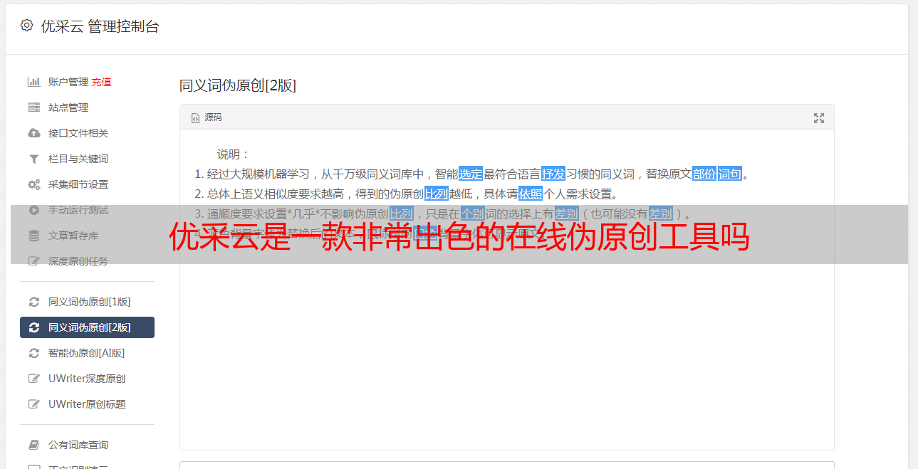 随着人们对互联网内容的需求越来越大,在线伪原创工具的使用也变得日益重要。优采云是一款非常出色的在线伪原创工具,它可以帮助用户快速地将文章内容转换为伪原创内容。此外,它还能够帮助用户通过SEO优化工具对文章进行详细的分析,从而使文章看起来更加专业、有趣。