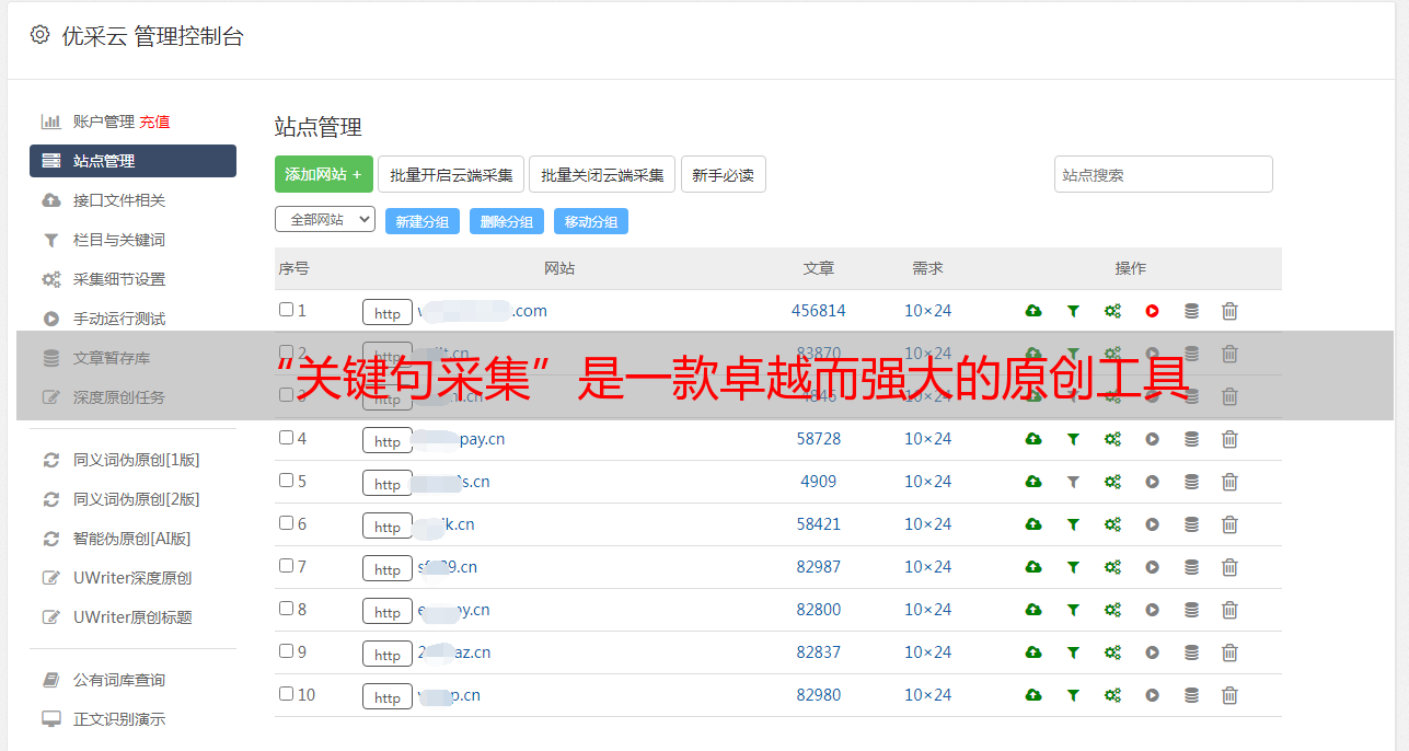 “关键句采集”是一款独特而强大的原创工具。它能够将客户行业内散乱无章的信息进行整理、分类、归类,从而节省大量时间和人力成本。它还能够根据不同行业对不同语义进行识别和分析,从而快速准确地找到适合不同行业的关键词。此外,该工具还能够根据用户信息进行文章内容的生成和修正,从而帮助用户快速生成原创文章。