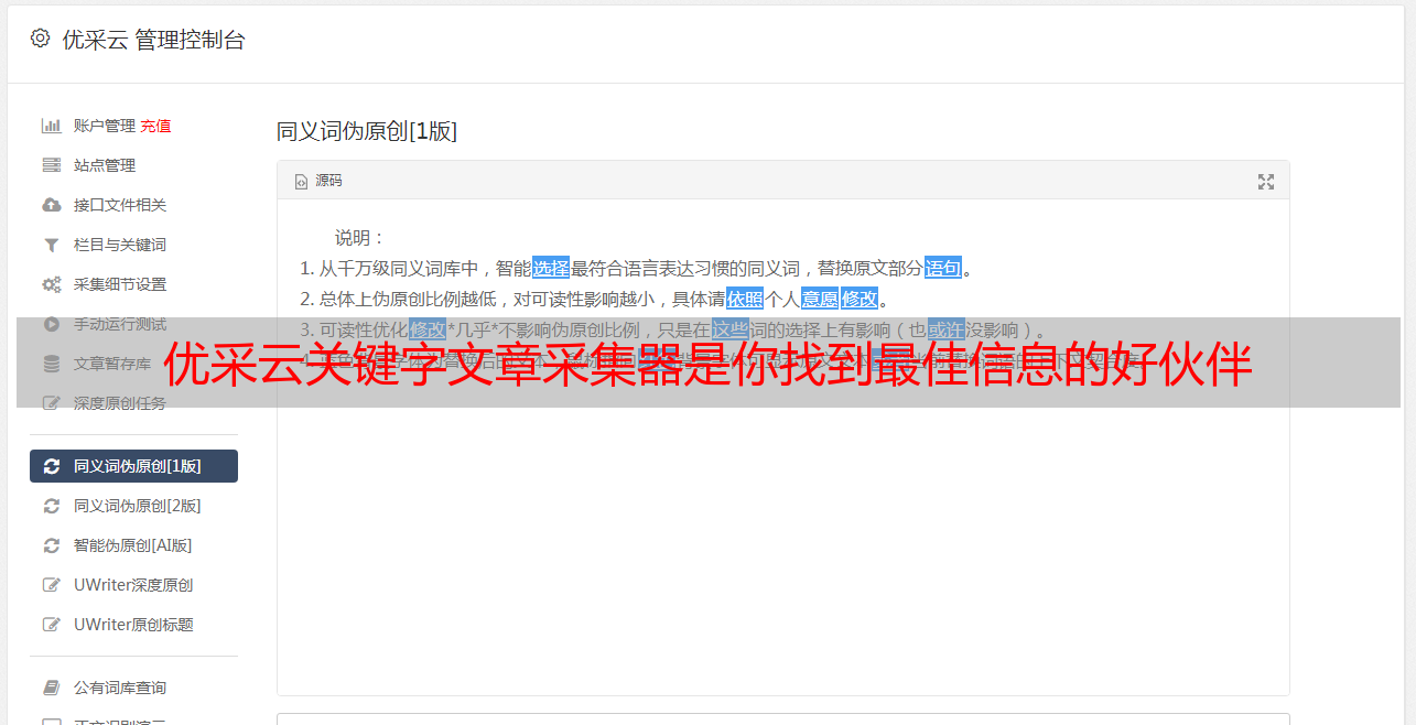 优采云是一款专业的关键字文章采集器,它能够帮助用户快速地从互联网上抓取各类文章信息。它不仅具有强大的采集功能,还能够根据用户需要进行SEO优化,以便在各大搜索引擎中获得最佳的排名,从而让用户得到最佳的效果。