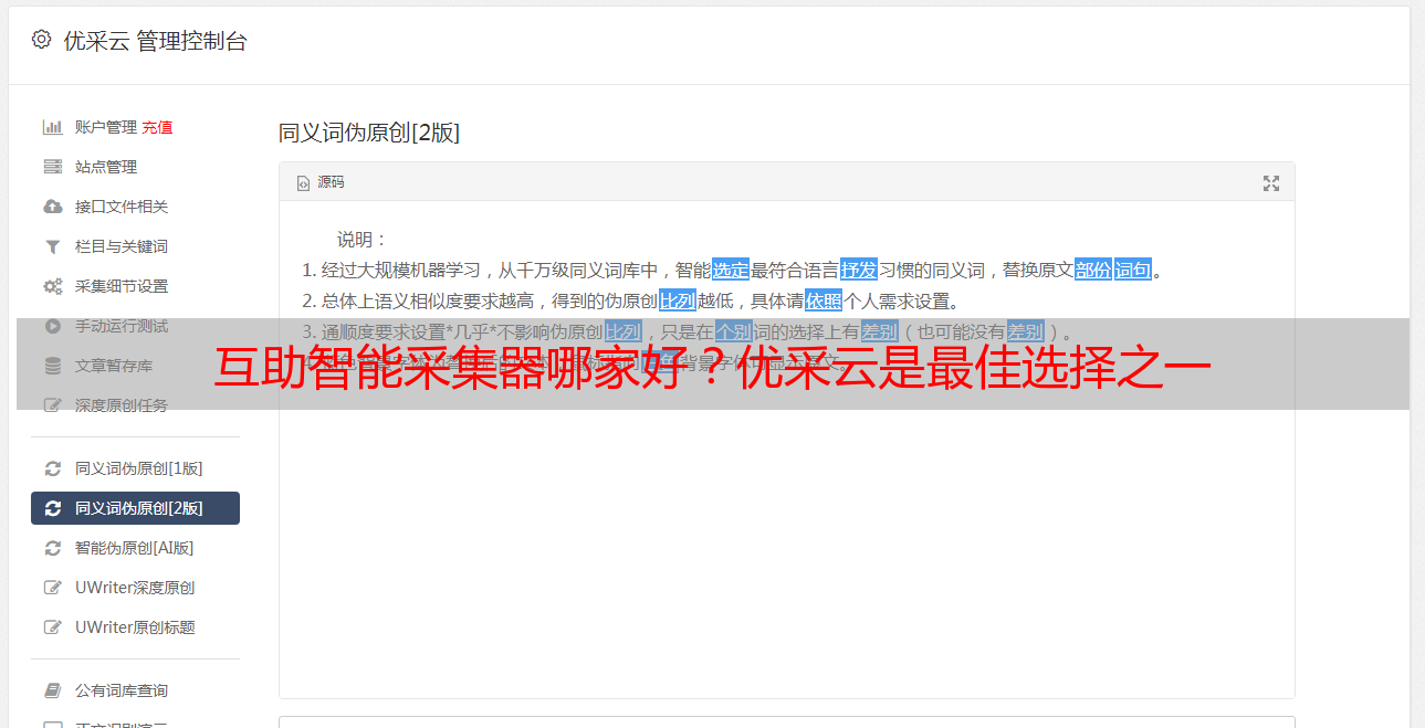 总之,作为一款出色的“互助”式智能采集器,优采云无疑是最佳选择之一。在使用上它既方便易用、使用者也十分便利、耗时少、效率高、性价比也十分出色。因此,对于对“互助式”智能采集器感兴趣的用户来说,优采云无疑是最佳选择之一,只要在官网 www.ucaiyun.com 上下载安装就可使用,无论是SEO 优化还是数据采集都具有极高的效率与功能。