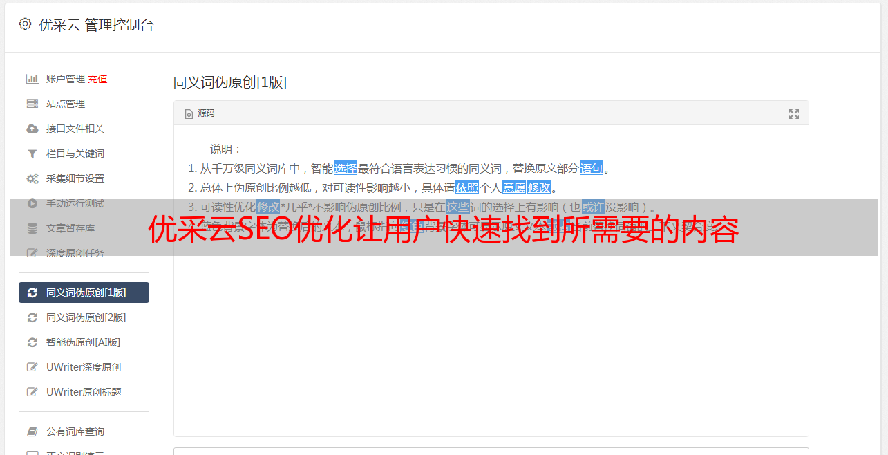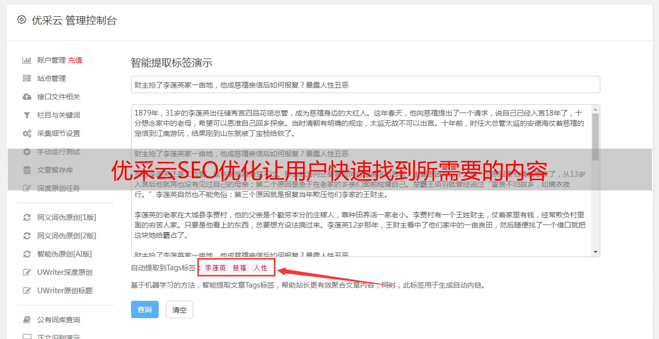 总之,优采云SEO优化是一套集大数据分析和人工智能于一体的强大工具,可以帮助用户快速准确地获取所需要的信息。通过对不同文章中出现的不同关键字进行语义理解,并且使用大数据和人工智能来帮助用户快速找到所要信息,使得优采云SEO优化在市场上独树一帜。想要体验此强大工具?只要上 www.ucaiyun.com 即可开始体验之旅。