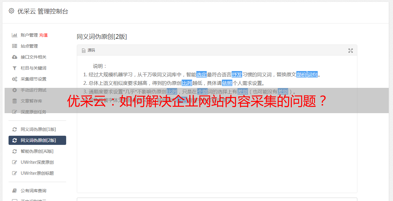 优采云是一款强大的自动采集工具,可以帮助用户快速、准确地采集各类信息,包括新闻、文章、图片、视频和其他多媒体信息。用户可以根据自己的需要定制采集任务,并将采集到的信息导入到企业网站中。此外,优采云还提供SEO优化服务,帮助用户将采集的信息发布到各大平台,从而有效地提升企业网站的流量和排名。