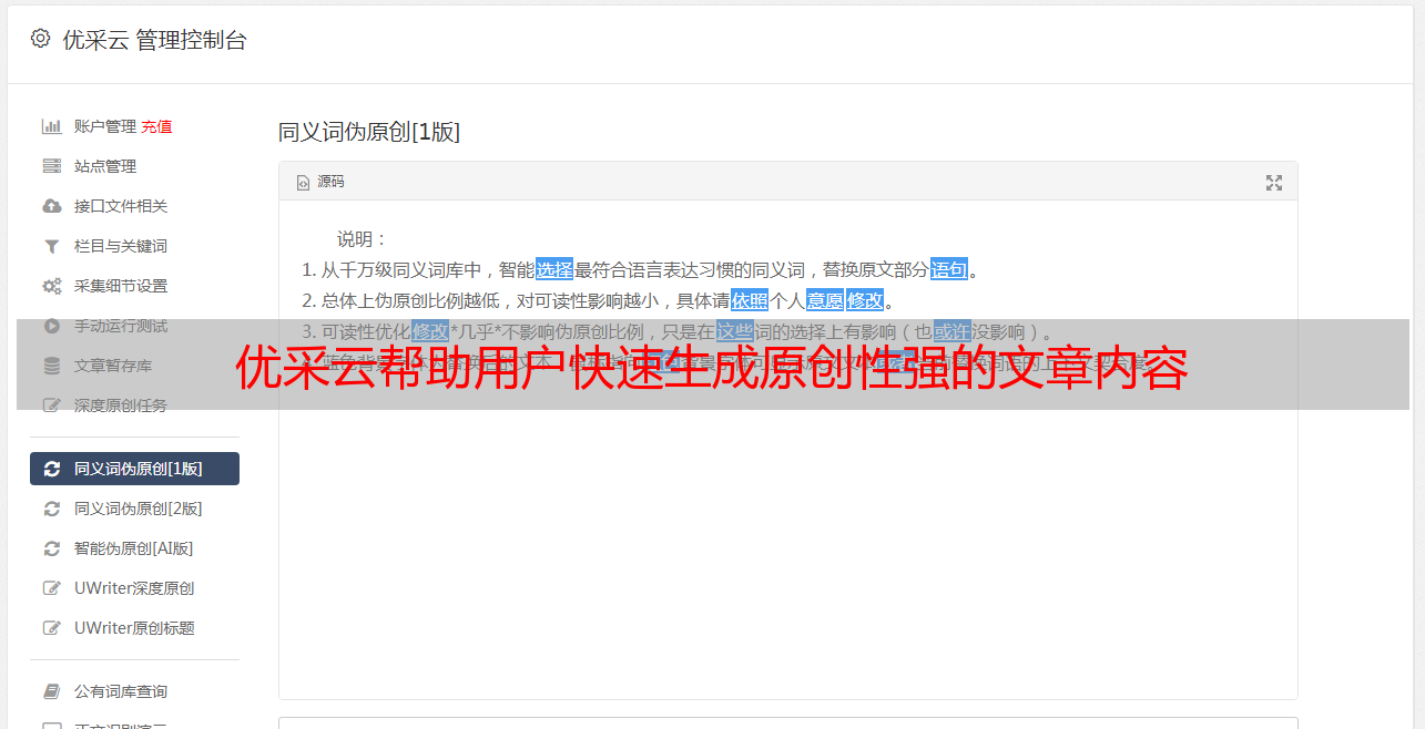 优采云帮助用户快速生成原创性强的文章内容