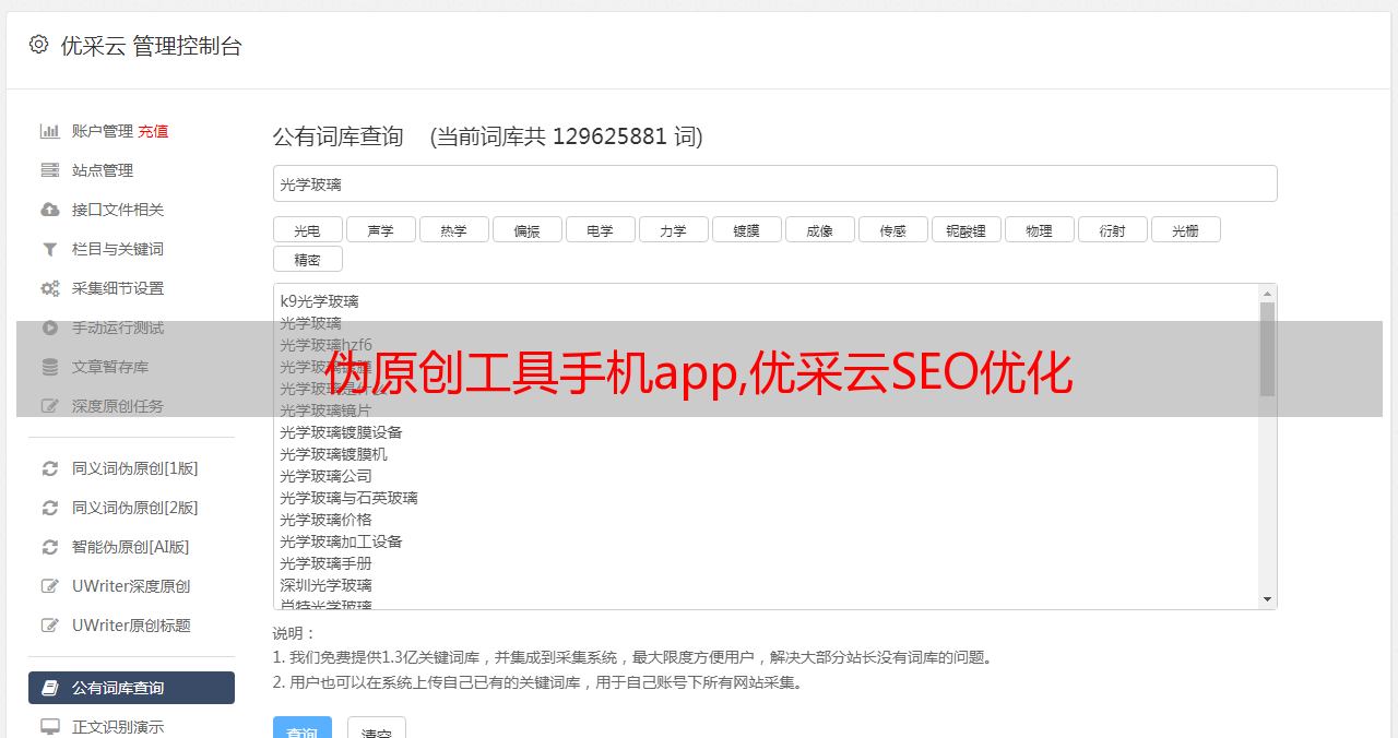 其中,优采云SEO优化是一款功能强大的伪原创工具手机app,它可以帮助用户快速生成高质量的内容,并且还可以根据用户的需要进行文章的修改和编辑。该软件还可以通过对文章进行语法、语义、关键词、标题和图片等方面的处理,帮助用户快速生成SEO友好的内容。此外,该软件还能够帮助用户快速分享内容到各大社交媒体平台上。