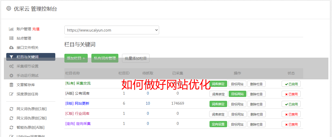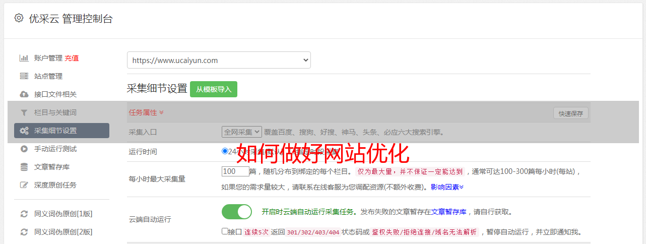 网站Map Settingshtml网站Map(为搜索引擎构建良好的导航结构。横向和纵向地图:01横向用于频道、栏目、主题/02纵向主要用于关键词每个页面都有一个指针网站map链接)XML网站Map(sitemap.xml提交给百度、google) 四、关键词部署步骤选择关键词:(确定target关键词target关键词definition on the extension 模拟用户的思维设计关键词research 竞争对手的关键词) 页面关键词优化序列:(final page>topics>columns>channel>homepage final page: long tail关键词topic page: [a, 流行关键词b, for热点关键词制作话题c,关键词相关信息聚合d,辅以文章内链导入链接】栏目页面:fixed关键词频道页面:目标关键词主页:做行业一二关键词。