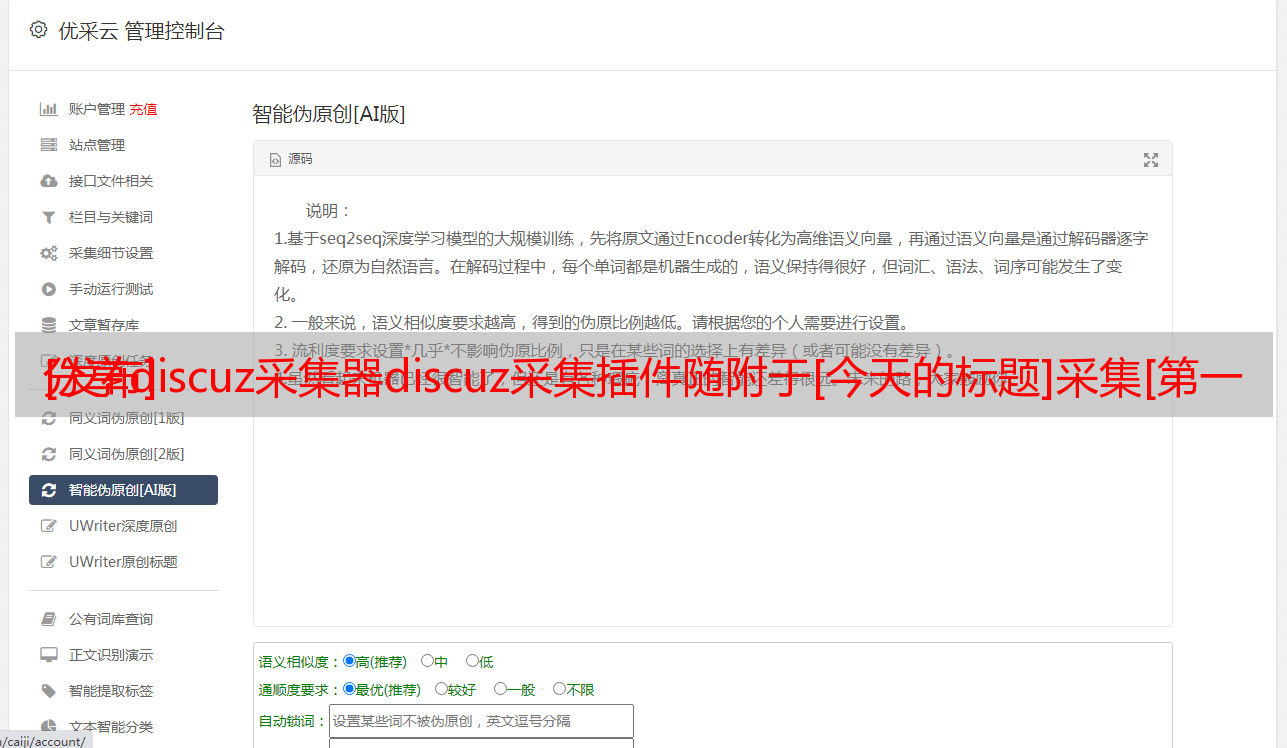 优采云 发布时间: 2020-08-08 10:02discuz采集器带有discuz发布界面,可以采集当今的头条新闻. 此discuz采集插件可与优采云采集器一起使用. 您可以指定一个或多个关键字,并采集当今的标题. (您也可以指定作者来采集它,它已经被编写了,请查看需求然后再提供)