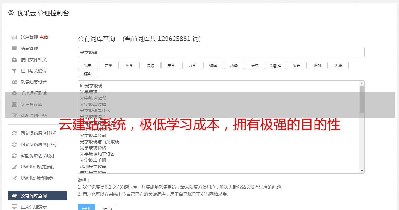 云建设系统,学习成本极低,目的性强:最快拿到网站,最快赚钱!经过3年的完善,拥有成熟的云模板库,在线网站,自动域名分配或绑定,网站的平均服务器成本低至几毛钱。超低的服务器成本+极快的建站人工成本是整个系统的核心。