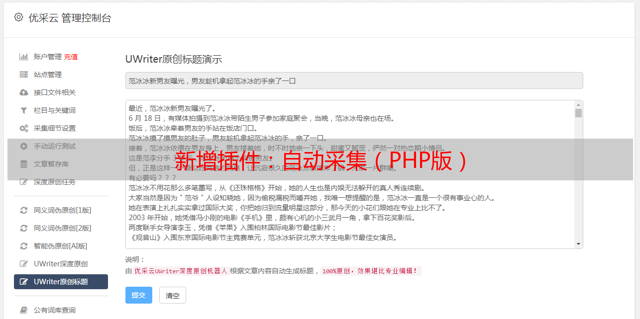 再次警告:自动采集只是使你网站每天可以手动采集更新几篇文章,无法作为实时采集更新用(程序自身资源限制,无法做到采集软件那样高频度采集操作,故该插件采集有一定时间差)。