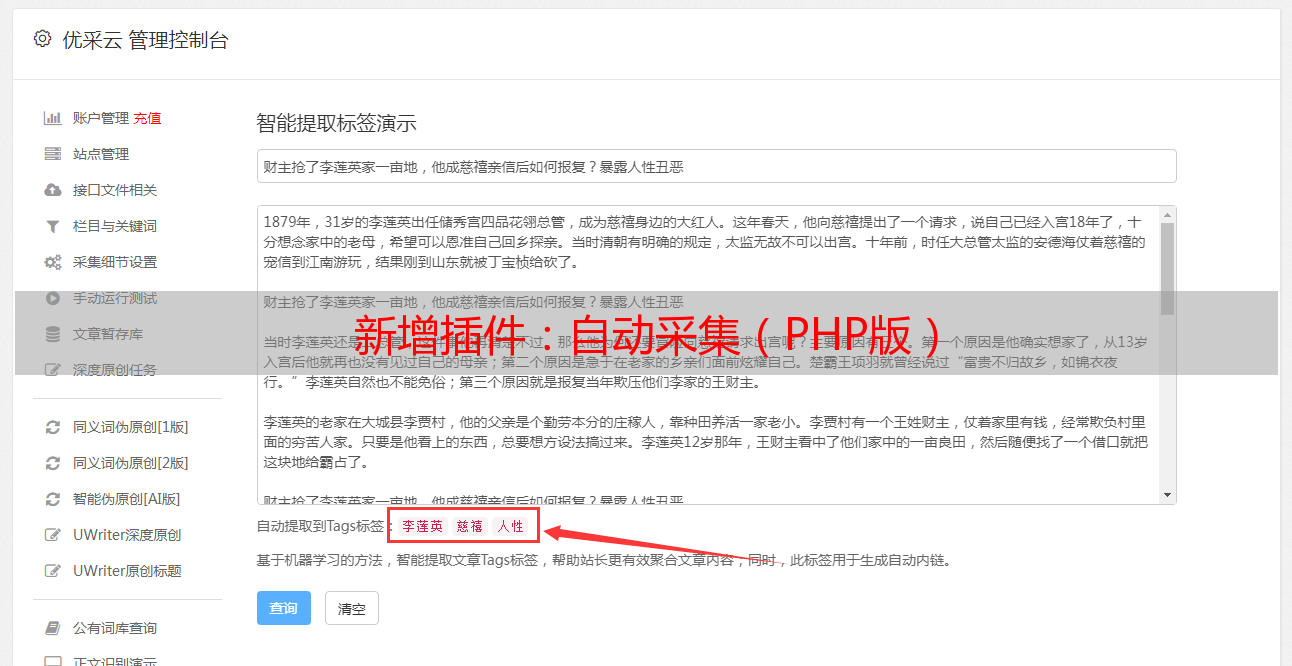 该插件收费(价格请在PHP版后台页头应用平台-插件应用查看),该功能须要已订购【采集系统】插件能够用,为须要耗费大量时间时常采集的用户来说是福音,后台设置后间隔时间文章采集插件,前台有用户访问网站时会触发该脚本,符合时间条件才会触发脚本手动采集。