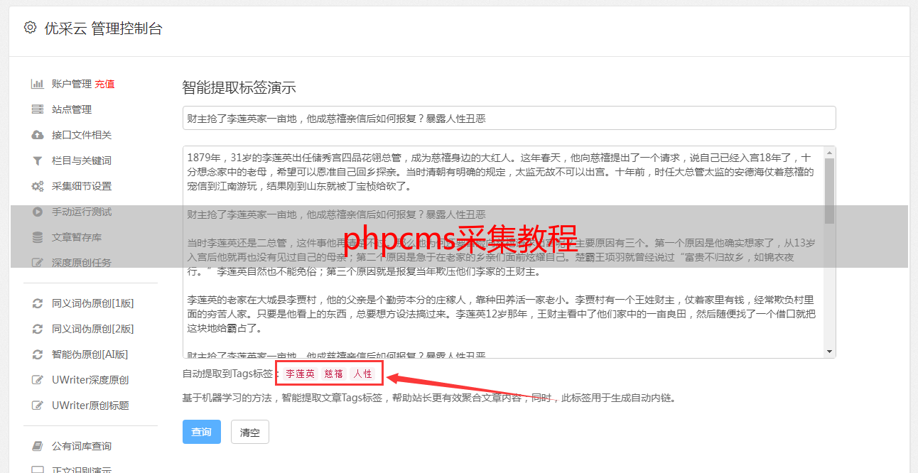 在标签和数据库之间的对应关系中,采集标签和数据库字段是一一对应的. 如果存在自定义标签,并且找不到对应的字段,则需要修改模型以添加字段,然后修改模板以显示它,这对技术要求很高. 不适合新手. 此外,该系统还具有一些处理功能,这些功能也非常实用.