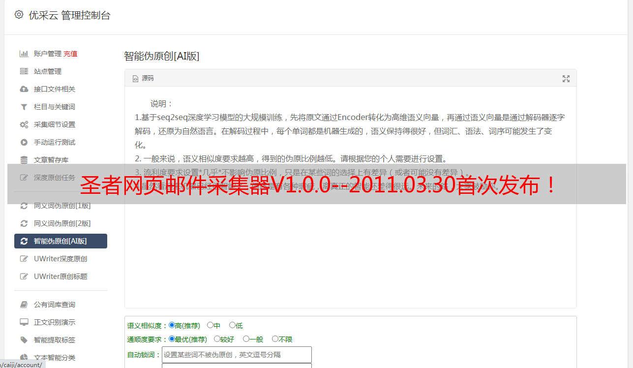 优采云 发布时间: 2021-06-29 04:15圣者网页邮件采集器V1.0.0--2011.03.30首次发布!