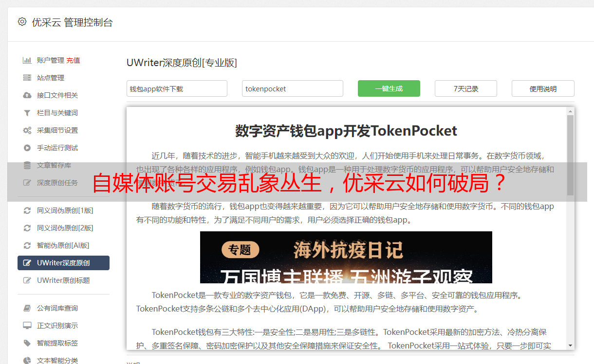 面对当前复杂的市场环境,优采云作为一个专业的内容管理平台,为自媒体账户买卖提供了有效的解决策略。通过使用优采云,消费者得以更方便快捷地处理账号内容,同时也能保证账号信息的准确性和一致性,进而提升交易的公信力。