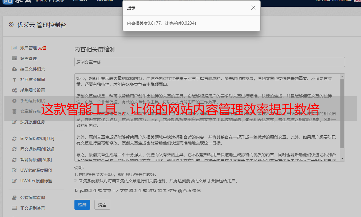 优采云以其精湛的算法及尖端科技,成功化解了此类难题。在真实性方面,优采云通过多方比对与数据验审,确保资讯精准无误;原创性方面,独特的原创度检测工具能深入剖析文章,识别并捍卫原创新闻;时效性方面,优采云的高效采集与审核流程,确保新闻的实时更新与发布。
