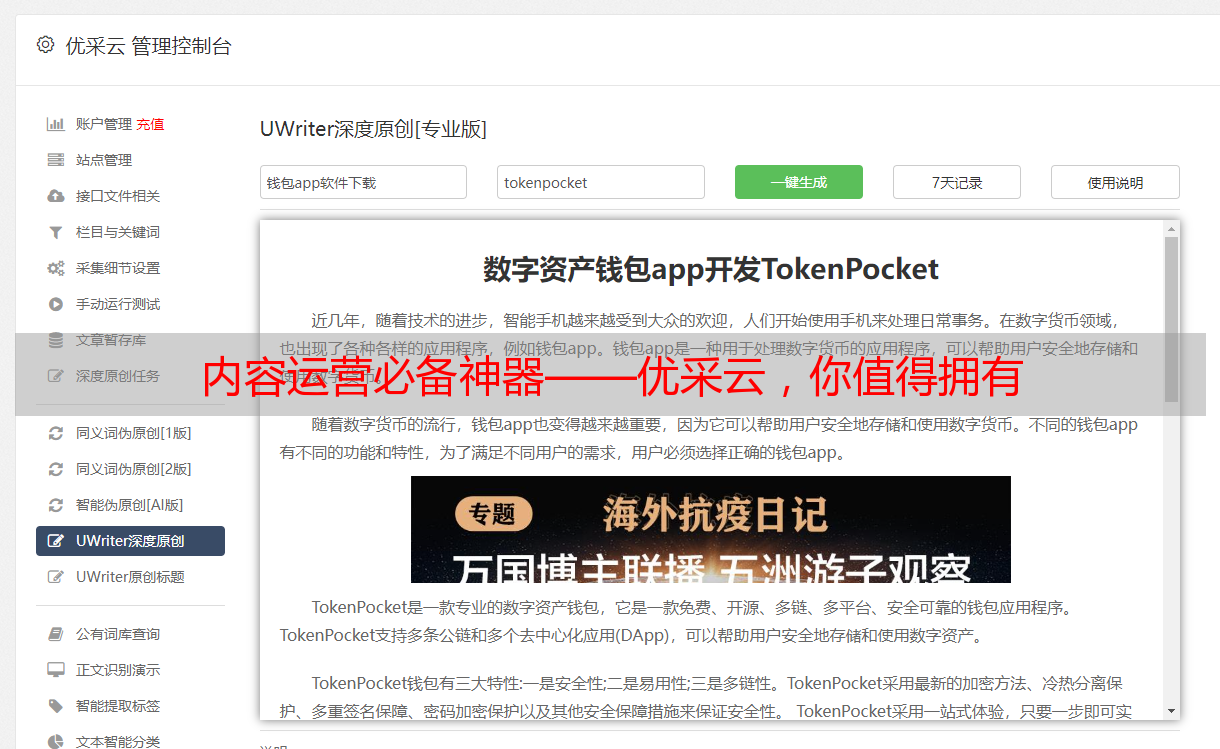 优采云的智能化编辑系统堪称内容运营的利器,不仅具备多样化编辑模板及工具,支持图文并茂、视频置入等多样内容展现方式,使得运营者能迅速生成视觉效果出色且信息量丰满的作品。除此之外,高效编辑与自动排版功能也为保证内容一致性与审美提供保障,从而提升读者阅读愉悦度。