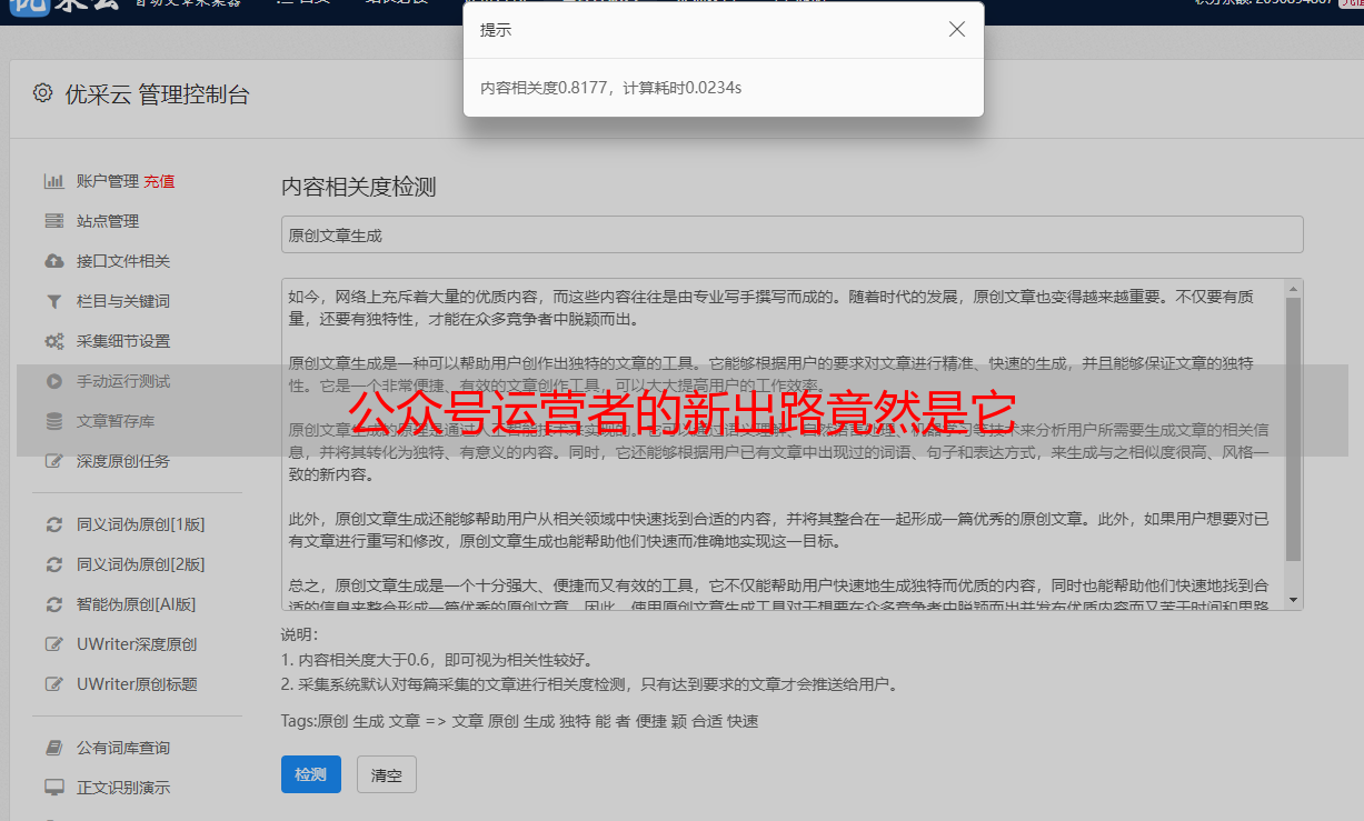 优采云 发布时间: 2024-07-13 07:51在网络信息爆炸的时代,优质原创内容日渐匮乏,公众号运营者面临严峻的创作挑战。据此背景,课题为如何高效创作公众号内容以应对此困境。优采云这一卓越的内容采集与处理工具,现已成为公众号运营者应对此类挑战的新途径。本文将着重介绍优采云的功能特性及其在公众号文章伪原创方面的应用,同时给出实用的操作建议。