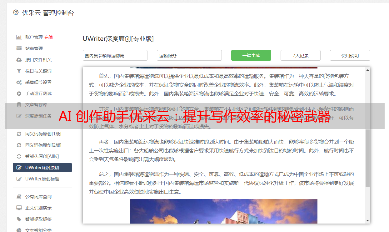 优采云不止于文本生成,更集多种实效性功能为一体:包括语意校对及文章润色升级等。此举将其塑造成完备的内容创作平台。