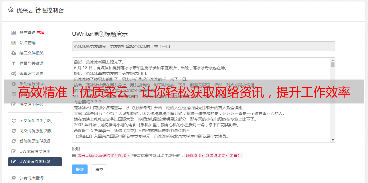 优采云致力于通过内容管理平台实现高效的内容管理与分析,以满足用户迅速获取有价值信息的需求。该平台支持对采集内容的分类、标签标注及搜索功能。