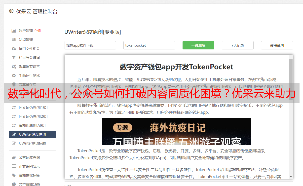 优采云 发布时间: 2024-07-15 15:49数字化大环境下,公众号作为核心的信息传递载体愈发重要。然而,面对膨胀的内容量,公众号间的内容同质化现象越发凸显,这无疑危害到用户的阅读感受乃至公众号的品牌价值与竞争实力。为此,公众号运营方亟需探寻如何通过伪原创或创新型内容的创作,强化内容的独特魅力并提升其吸引力,以应对这一严峻挑战。
