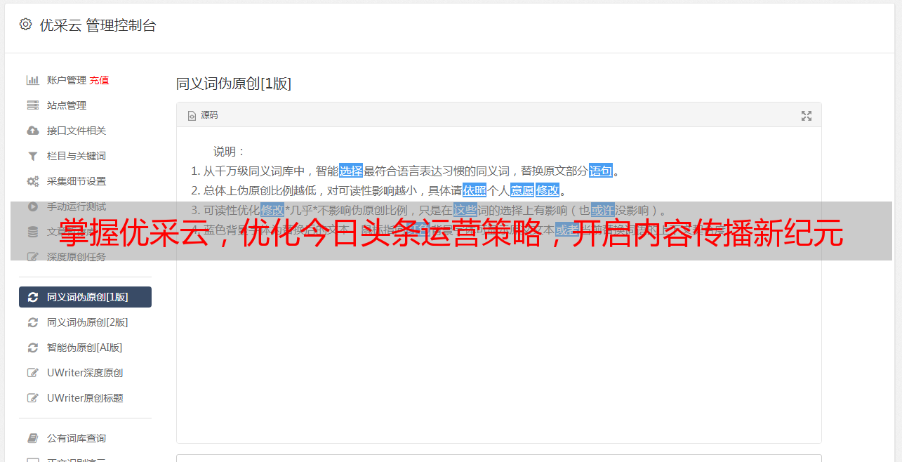 优采云为助力头条运营创新提供了强大功能,通过其先进的内容创造及优化技术,可实现智能化编辑与个性化推送。借助此平台,运营人员能迅速制作并发布引人注目的新内容,从而激发用户关注。