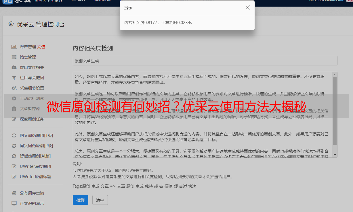 身为一名资深微信公号撰稿者,本人有幸试用优采云原创检测工具。在使用过程中观察到其具有以下优势: