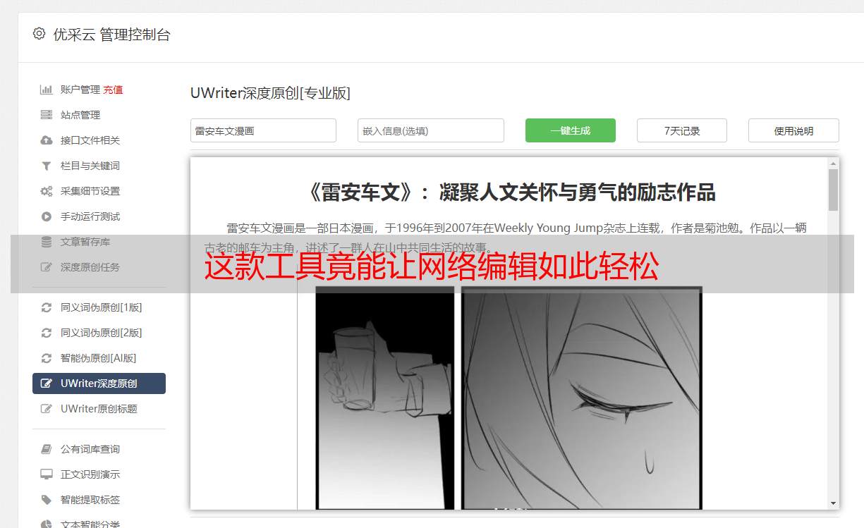 优采云,作为百度文章采集站的实用工具,便于用户迅速筛选高品质资源。其功能包括选取资源、自动抓取、个人资源库管理及推荐资源,显著提升了写作效能和品质。在创作阶段,我极力推荐运用优采云,它将是你宝贵的助手。