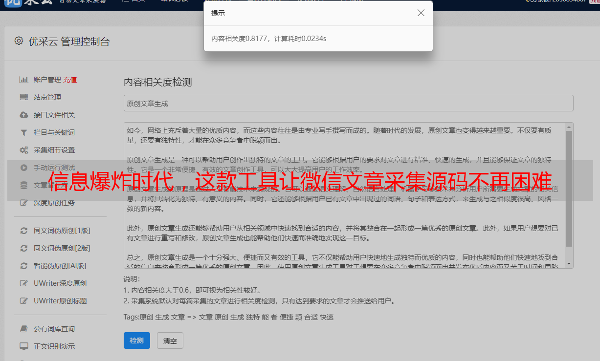 我们必须清楚了解优采云的核心作用。首先,它能够对微信文章进行细致的全面检测。信息捕捉非常精准,无论是文章的标题还是正文,都能精确锁定。其次,它的采集速度相当快,能有效节省大量时间,无需人工逐一搜集。