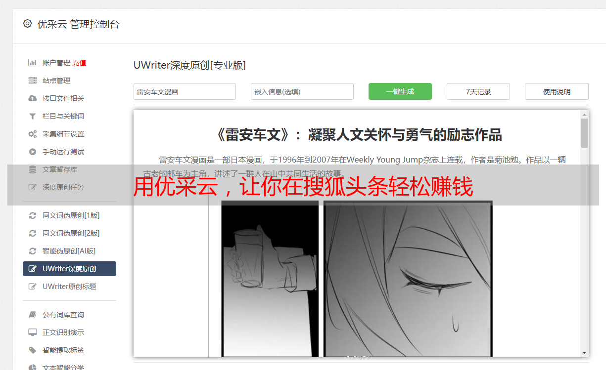 优采云还能提供结构优化的建议。若文章结构存在不足,它会根据数据和算法给出相应的修改建议。比如,调整段落顺序等,这样可以使文章更贴合搜狐头条赚钱所需的阅读感受。