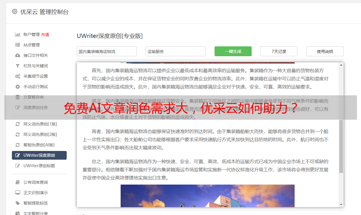 优采云的免费润色功能非常实用。这项功能能够帮我们节省人工润色的费用。对于预算有限的小团队和个人创作者来说,它显得尤为贴心。更重要的是,它的润色效果相当准确。