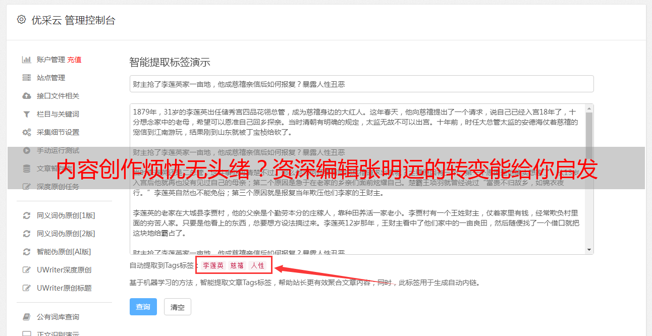 张明远发觉,系统另外给出了热点植入,原创度提升这样的高级功能,这使得所生成的内容更具备时效性以及独特性,