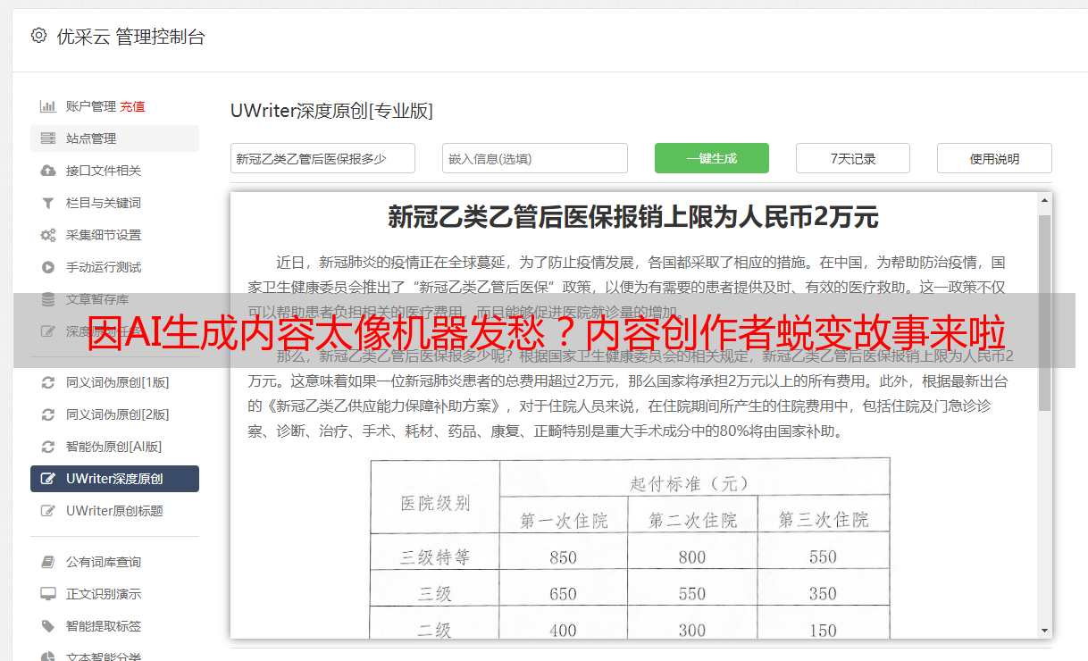 优采云 发布时间: 2025-10-30 20:15倘若你正因AI所生成的内容酷似机器而心生烦恼,那么这篇文章会为你揭晓一个内容创作者的真切蜕变故事 。