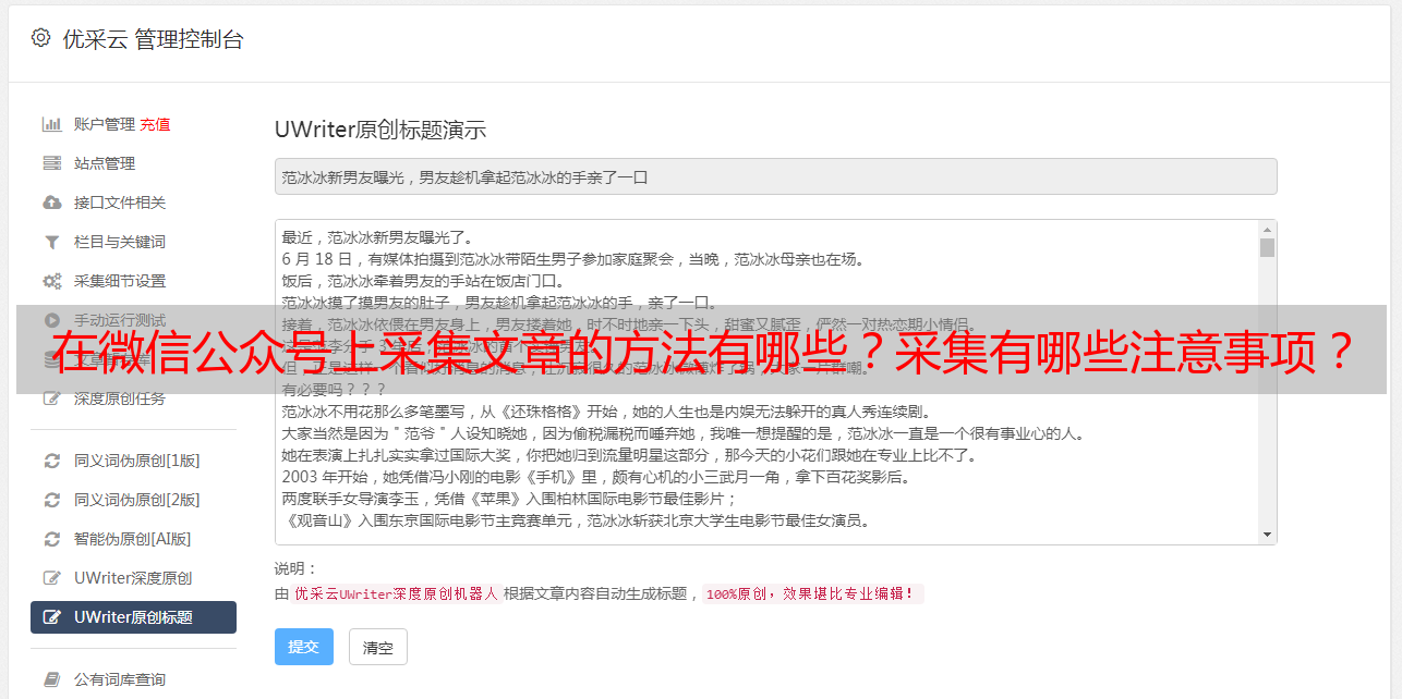 您可以批量粘贴关键字以进行搜索,选择采集日期,可以伪原创标题和内容,识别文章是否为原创文章以及支持将一篇文章分发到网站.