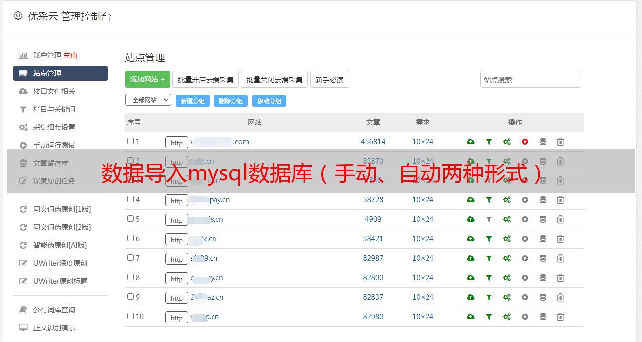 优采云 发布时间: 2020-08-09 07:50本教程将为你们讲解怎样将采集好的数据导入到mysql数据库中,这里给你们讲两种导入方法
