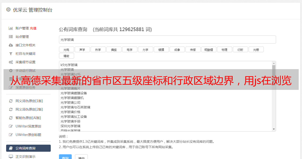 优采云 发布时间: 2020-08-09 17:57从高德采集最新的省市区五级座标和行政区域边界,用js在浏览器中运行