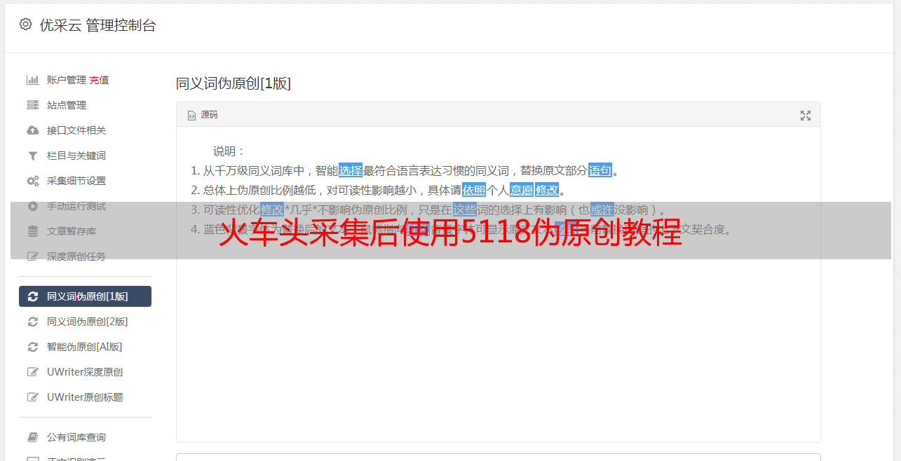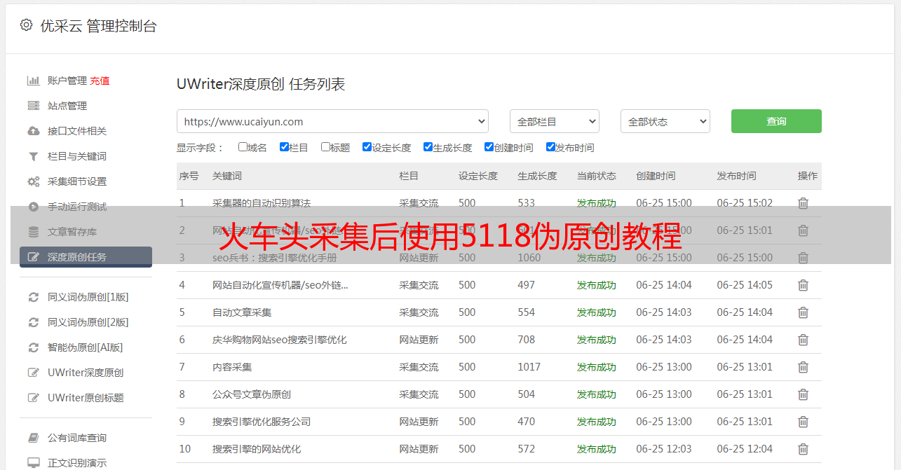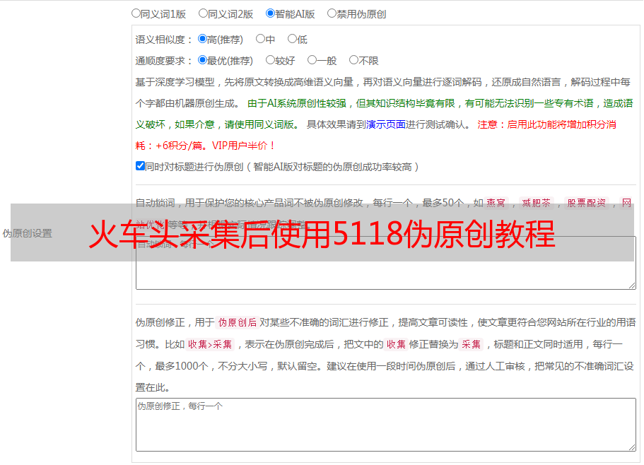 在列车采集器中,利用5118智能原创插件,不再须要经过人工处理,即能批量生产出内容指纹完全不同的文章,大幅提升了内容SEO采编的工作效率,让文章更容易被收录。5118智能原创-火车采集器插件下载链接: 提取码: umjx