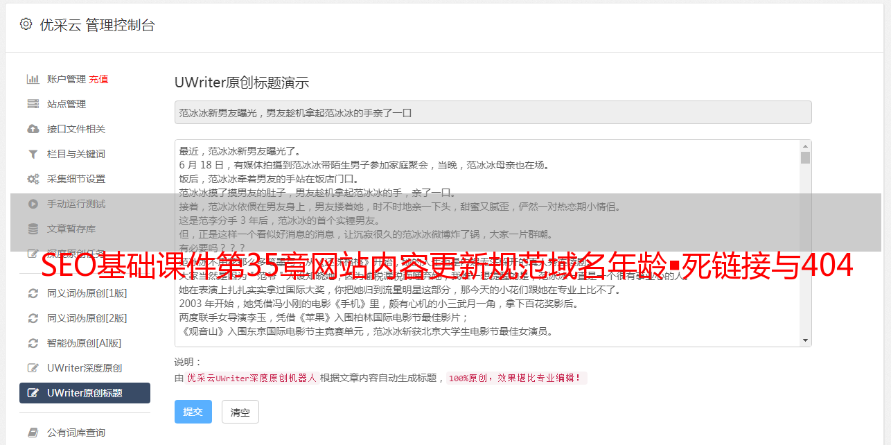 通过插入方法修改段落出现的顺序。例如,原创段落为12345,调整后的段落为54321或45213。 修改内容-词替换法 词替换法使用含义相似的词来替换原创内容中的词。比如今天下午,万里无云的心情也是多余的开朗,可以变成今天晴空万里的惬意午后。修改后的内容数字替换方法。数字代换法可以改变内容中的数字,比如原来的内容,造成1998年以来最大的洪水。可以改变,造成1998年以后最大的洪水灾害。比如原来的内容是卖100万张票就可以改为100万张售票伪原创Notes 代表词需要替换或修改,如地理位置、年龄、姓名、*敏*感*词*
