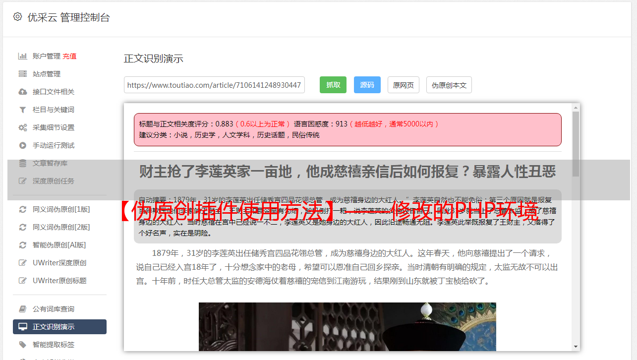 答案:这是一个采集器。 采集之后,如果打开了插件,采集收到的内容会通过插件进行处理,然后保存。我们的插件是伪原创,所以采集的内容会保存在伪原创之后。