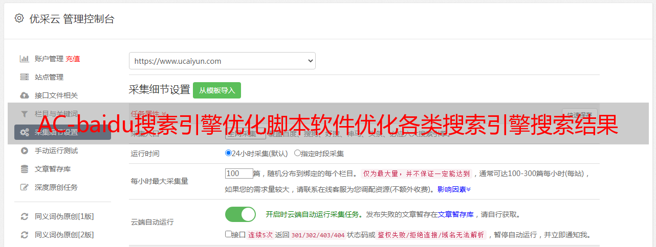 优采云 发布时间: 2021-07-24 04:19AC-baidu搜素引擎优化脚本软件优化各类搜索引擎搜索结果
