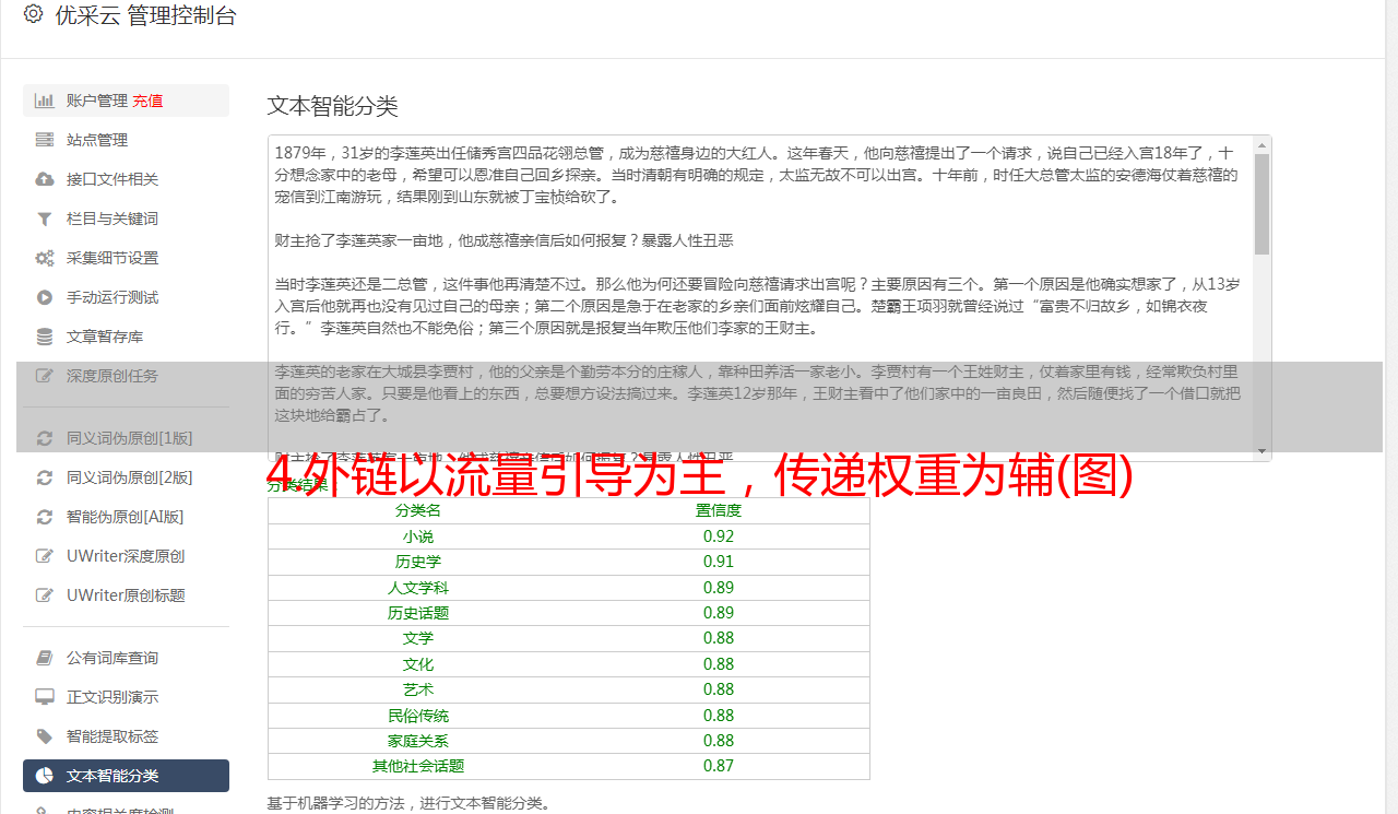 4.新闻页布局长尾关键词如果分站方式不可行,只能从新闻页面关键词布局长尾。虽然可以增加网站自身的权重,但是整体效果和竞争力都是,而且没有子站的好效果,愿意做子站的公司很少。对于大多数人来说,这可能不是一个机会。 5.新网站 仍然基于原创。对于刚刚上线的新网站,我们尽力做好原创内容,让搜索引擎蜘蛛每天都可以抓取我们网页的内容。增加其粘度。 6.外链以交通引导为主,权重转移为辅。以前我们发链接都是为了考虑如何留下超链接,如何添加锚文本,以及出站链接平台的权重是否高。现在,我们发送链接。只有一个目的,为我们的网页吸引流量。这就要求我们发布的外链关联度高、平台化、流量大。我们发布的外链质量也必须符合当前外链运营标准。