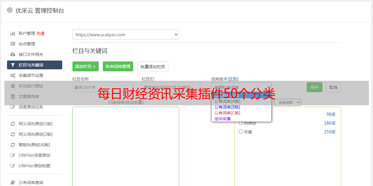 此插件可通过天人官方采集平台中转,来获取财经资讯的50多种分类下每晚更新的文章(旧文章不采集),也就是说可以获取全网海量实时更新的最新的文章。可配合手动采集插件实现全自动免维护更新网站的功能。