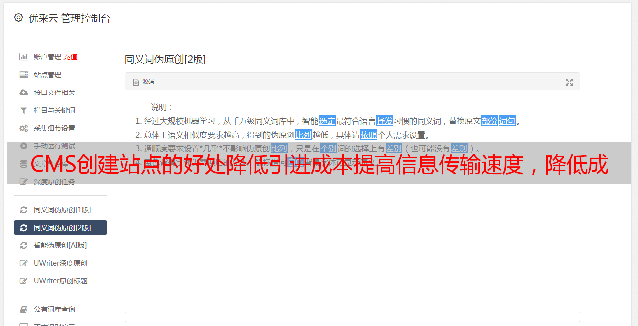 优采云 发布时间: 2021-08-15 18:18CMS创建站点的好处降低引进成本提高信息传输速度,降低成本您可以轻松更新