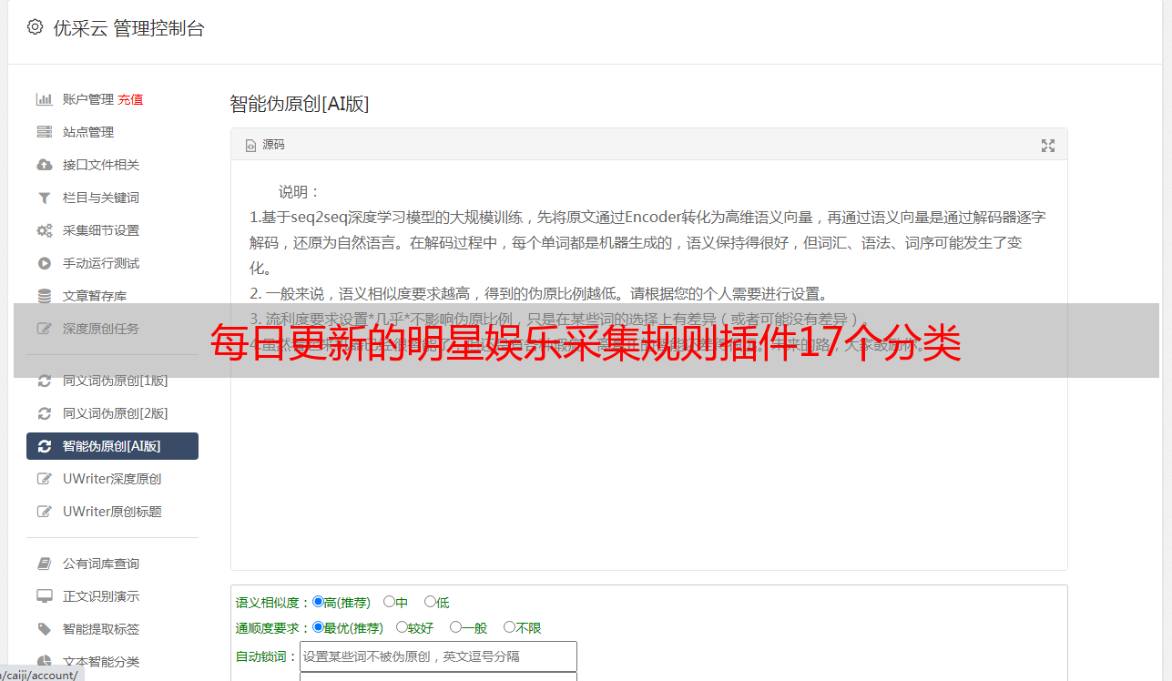 此插件可通过天人官方采集平台中转,来获取名星娱乐资讯的32多种分类下每晚更新的文章(旧文章不采集),也就是说可以获取全网海量实时更新的最新的文章。可配合手动采集插件实现全自动免维护更新网站的功能。