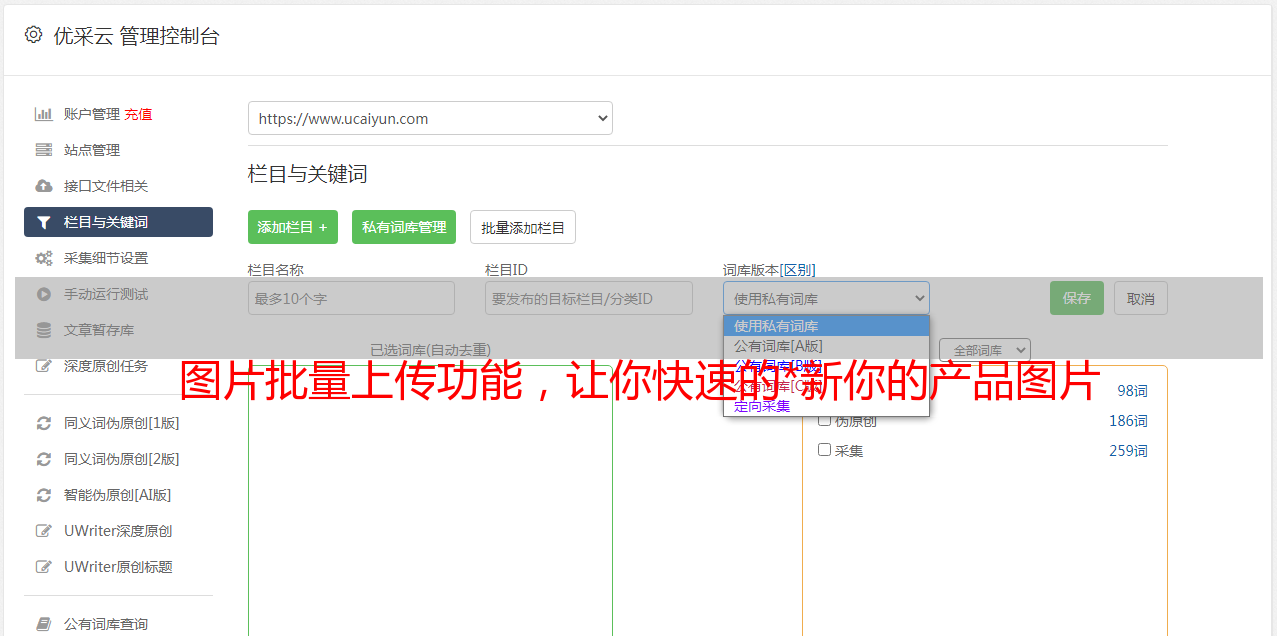 6.收录多项智能功能,如:一键采集关键词、一键采集图片、自动生成标题、自动生成内容、随机智能选择各种单词等;