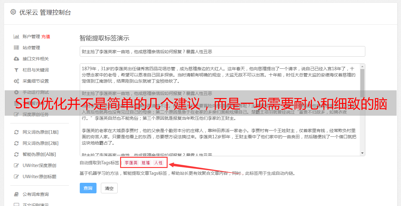 优采云 发布时间: 2021-08-22 21:02SEO优化并不是简单的几个建议,而是一项需要耐心和细致的脑力劳动